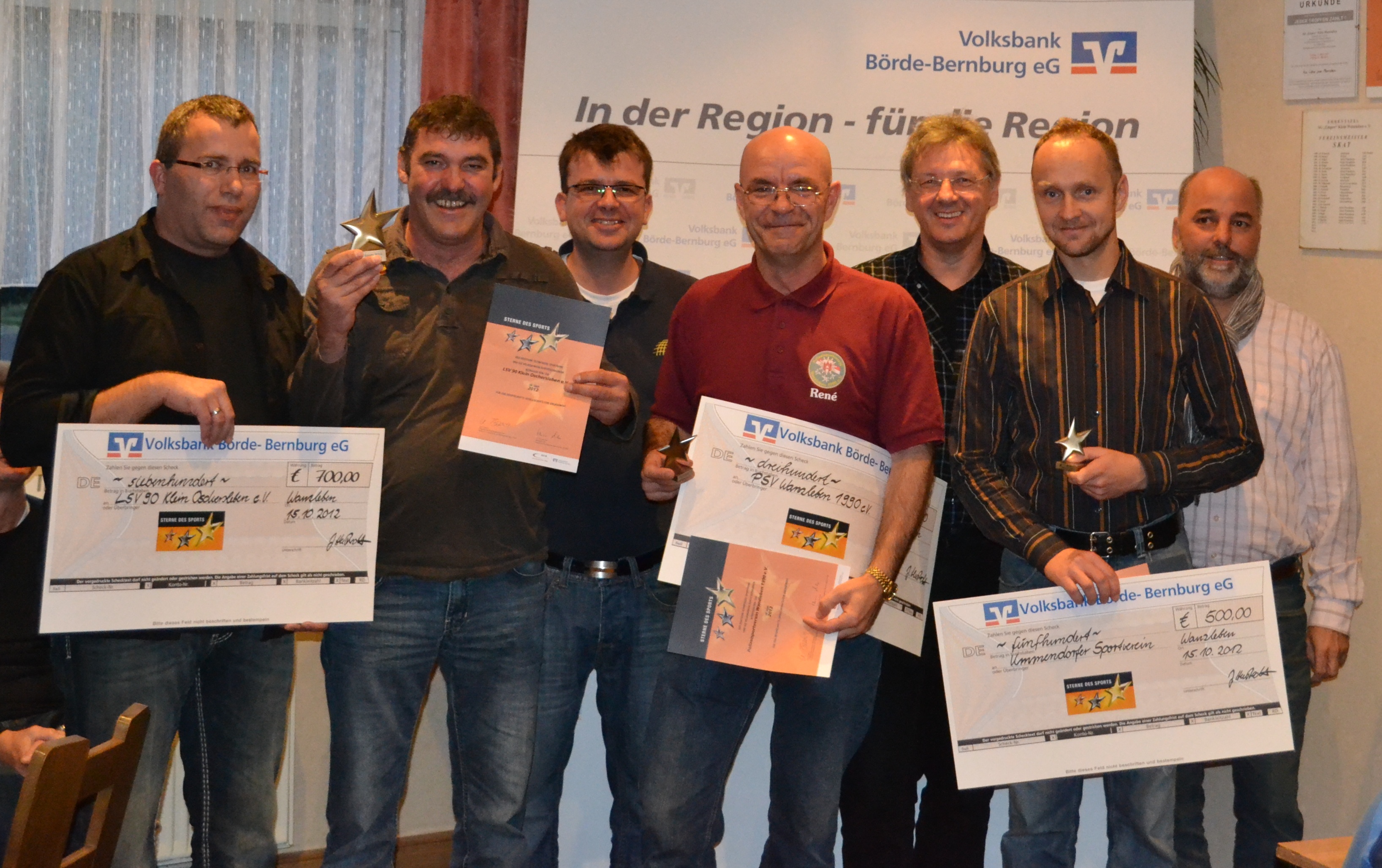 Bei der "Sterne des Sports"-Siegerehrung haben die Vereinsmitglieder des LSV 90 Klein Oschersleben (l., 1. Platz), des Ummendorfer Sportvereins (2. Platz) und des Polizeisportvereins Wanzleben (M., 3. Platz) von Torsten Winkelmann (r.), Vizepräsident des Kreissportbundes Börde, sowie von Jens Ackermann (3.v.l.), Vorsitzender der Sportjugend Börde, jeweils einen Prämienscheck überreicht bekommen.